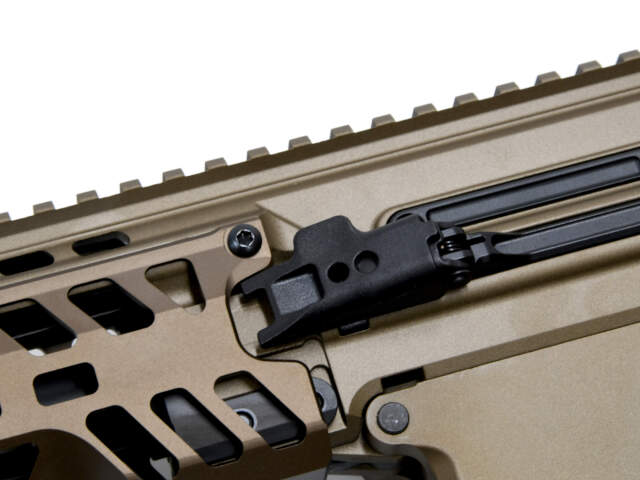 銃身は標準で約13インチ。フリー・フローティング構造の強化された M-LOK ハンドガードを持ち、各種光学照準器やアクセサリーの装着が容易です。給弾は SR-25 規格の着脱式マガジン(20〜25発)を使用。